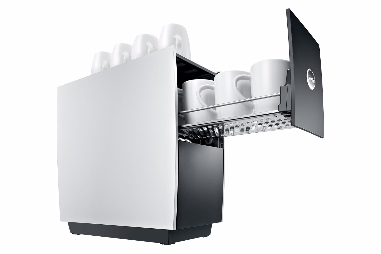 Dvě topná tělesa udržují šálky uvnitř při konstantní teplotě okolo 55 °C – ideální pro přípravu všech káv od ohnivého espressa až po cappuccino korunované mléčnou pěnou. Ohřívač šálků má také pasivně vyhřívaný hliníkový zásobník na své horní části.
