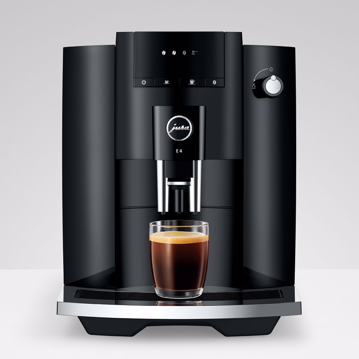 E4 má charakteristický design automatických kávovarů značky JURA. Vyznačuje se jasně vymezenými plochami a ostře vedenými liniemi. Úsporný tvarový výraz a zpracování s nejvyšší možnou precizností podtrhují prvotřídní kvalitu tohoto automatického kávovaru. Purismus se projevuje také ve výběru barev. Zatímco celý korpus je v decentní barvě Piano Black, chromované prvky udávají akcenty a jsou příslibem dokonalého výsledku kávy.