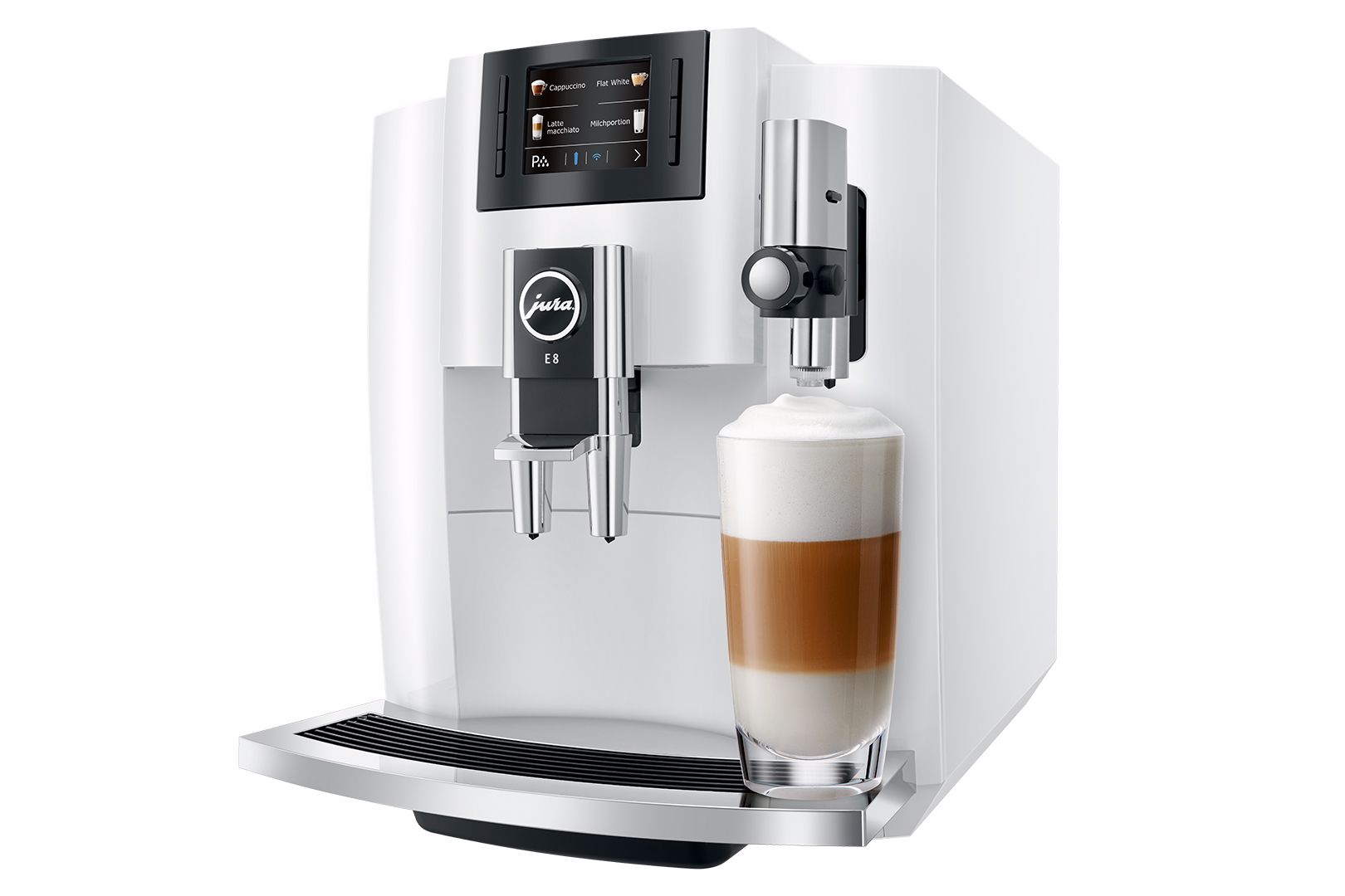Nejúspěšnější kávovar od značky JURA byl dále zdokonalován. Celkem dvanáct různých specialit připravíte s modelem E8 jediným stisknutím tlačítka. Novým přírůstkem do nabídky nápojů je espresso macchiato, espresso doppio, káva speciál a horká voda pro zelený čaj, vše připravované jediným stisknutím tlačítka.