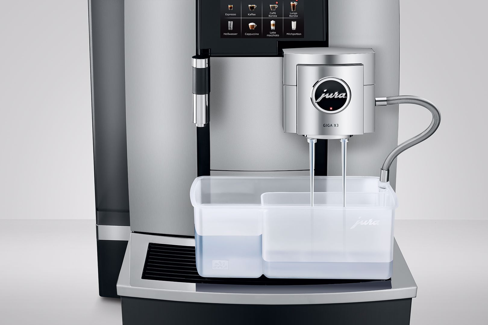 Stejně snadno, logicky a intuitivně jako ovládání probíhá i údržba kávovaru GIGA X3. Originální čisticí prostředky značky JURA i integrované programy proplachování a čištění zaručují hygienu s certifikací TÜV, a to jediným stisknutím tlačítka. Stejně promyšlené je čištění systému pro dávkování mléka. Spouští se plně automaticky a jediným dotykem displeje a zaručuje dokonalou čistotu při manipulaci s mlékem. Několika jednoduchými pohyby je možné rozložit masivní kombinovanou trysku. Vývody pro mléko jsou umístěny vpředu a jsou snadno přístupné, takže je lze v případě potřeby snadno vyměnit.