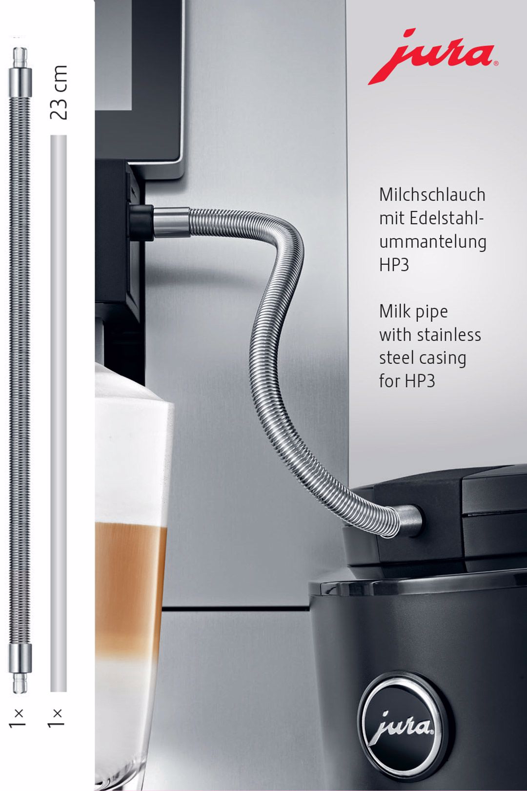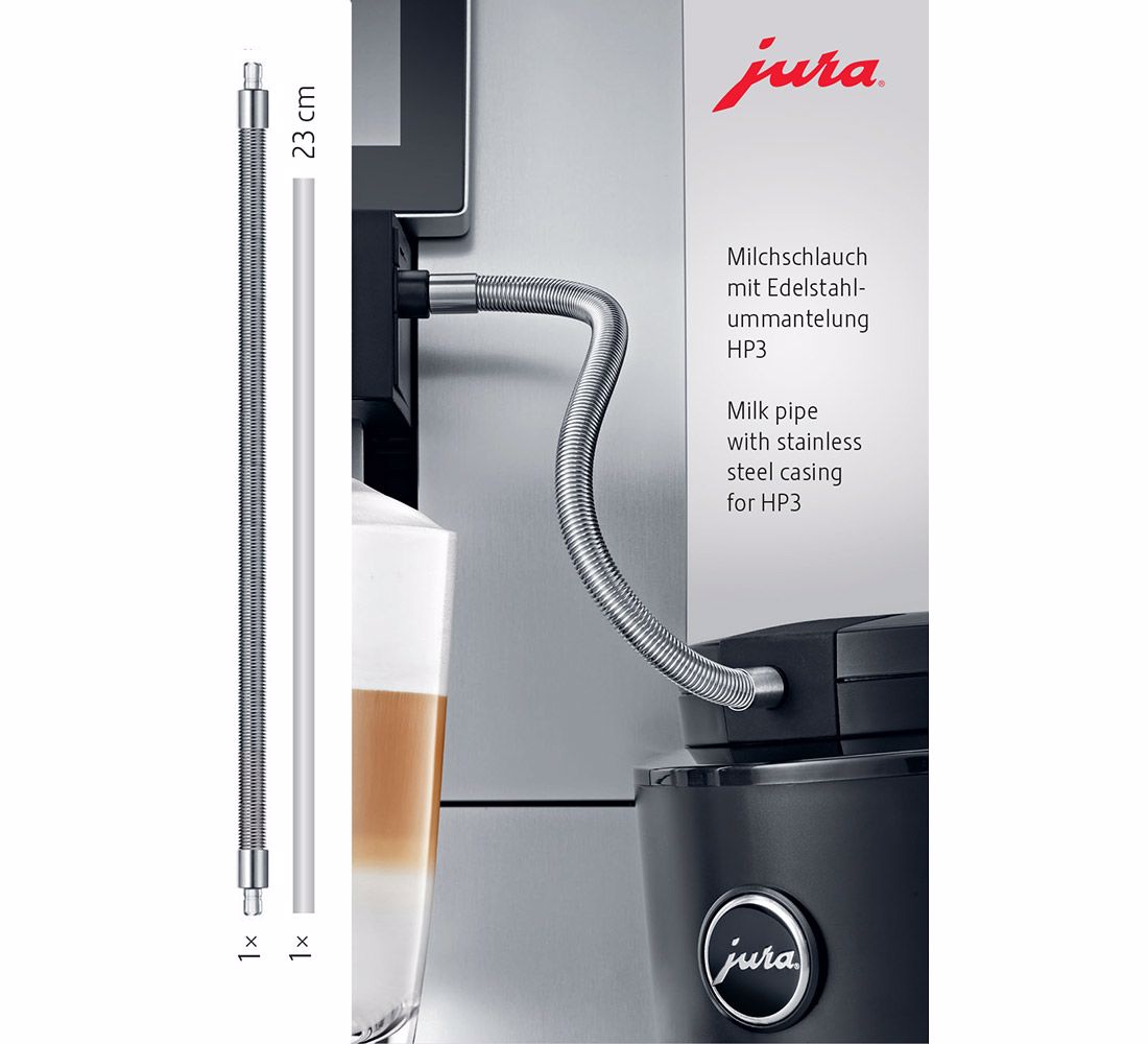 Hadička na mléko opletená kvalitní spirálovou pružinou z nerezové oceli spojuje nádobku na mléko s hubicí na mléko a dokresluje tak elegantní design každého plně automatického kávovaru. Neprůhledné opláštění z ušlechtilého materiálu zaručuje nejlepší ochranu před UV zářením a působením světla. Přesně slícované zásuvné spoje zajišťují vzduchotěsnost přechodů. Tato hadička je připravena k okamžitému použití a představuje tak optimální řešení pro maximální hygienu systému rozvodu mléka.