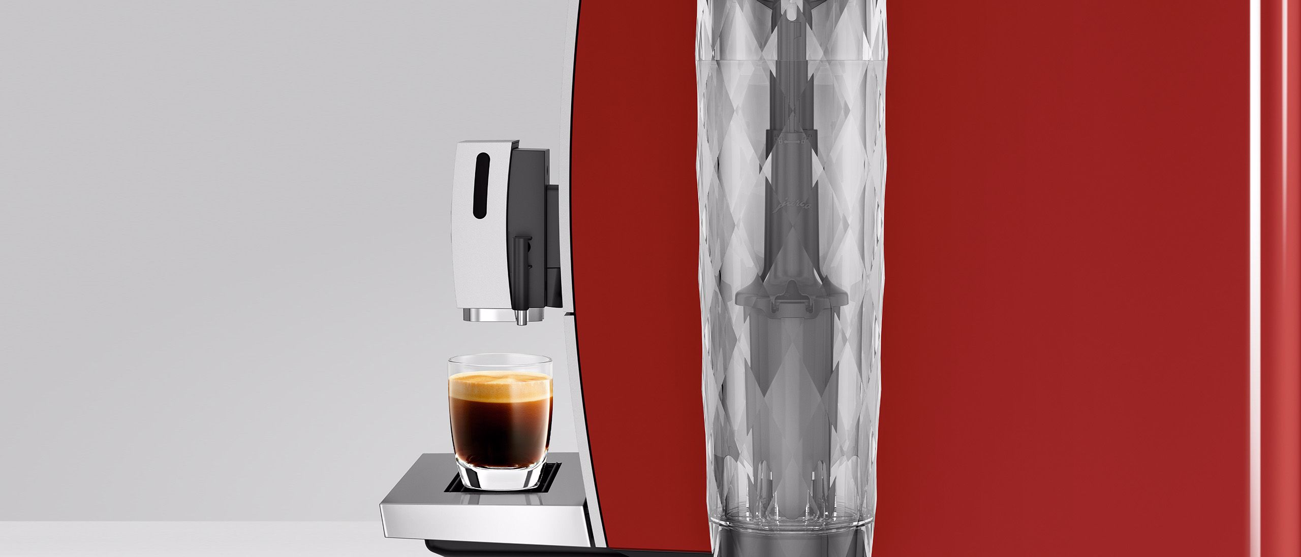 Působivým akcentem zaobleného designového provedení je kulatá nádržka na vodu. Její struktura, ve spojení s válcovým tvarem, je inspirována ušlechtilými křišťálovými karafami.